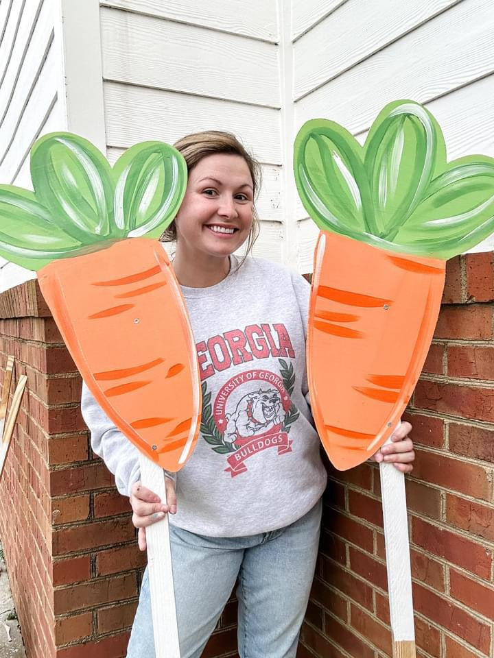 Price is for 2 staked. 36 inches tall from bottom of stake to top of carrot. Hand painted. ASSEMBLY REQUIRED IF SHIPPED ! Sealed front and back but recommended to be used under covered porch in planter.
