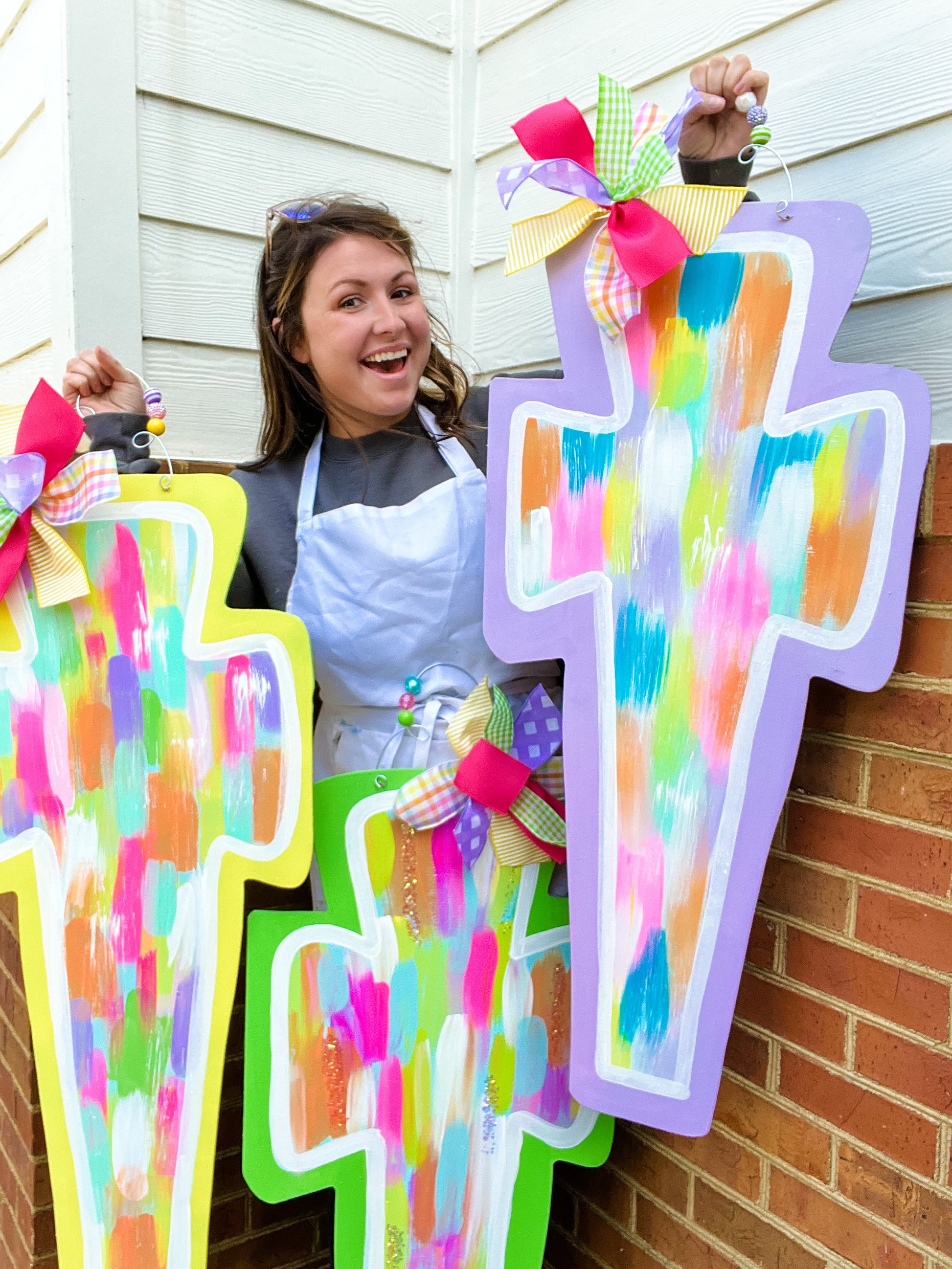I think I’ll call this a “mini XL” lol. Design. 17 inches across and 38 inches tall. Hand cut and hand painted. Sealed with clear coat. Beads and bow included.
