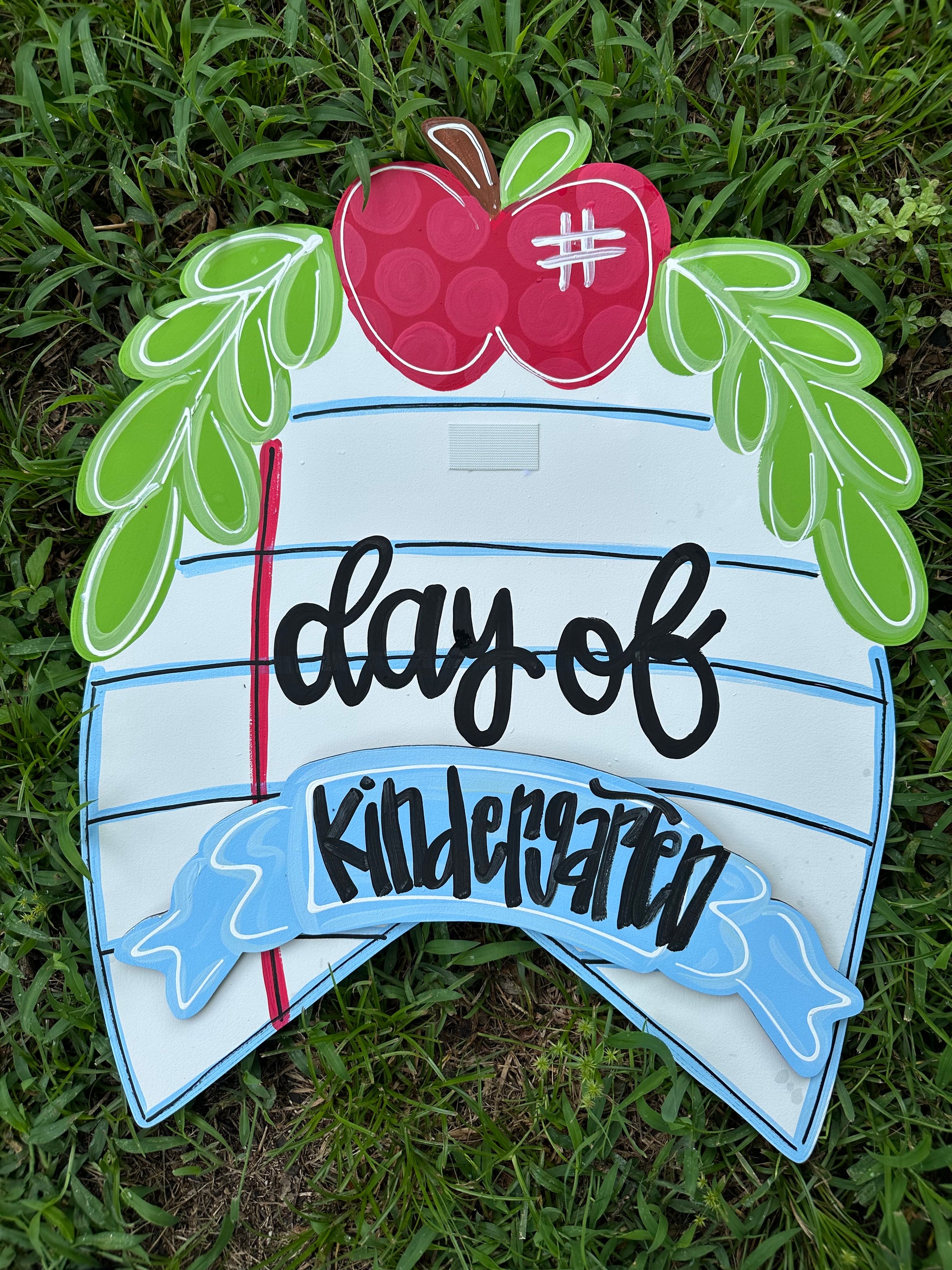 24 inches tall. Interchangeable pencil and banner at bottom. Fuzzy side of Velcro on the back of interchangeable pieces hard Velcro on hanger