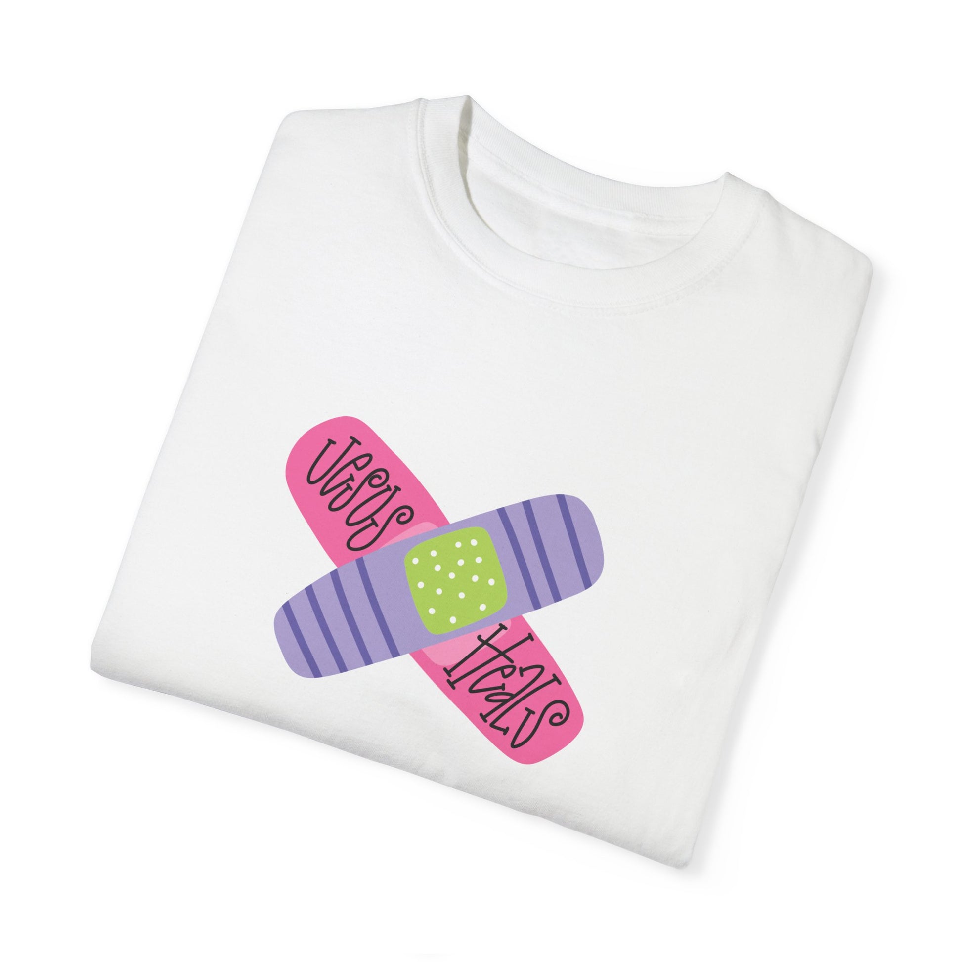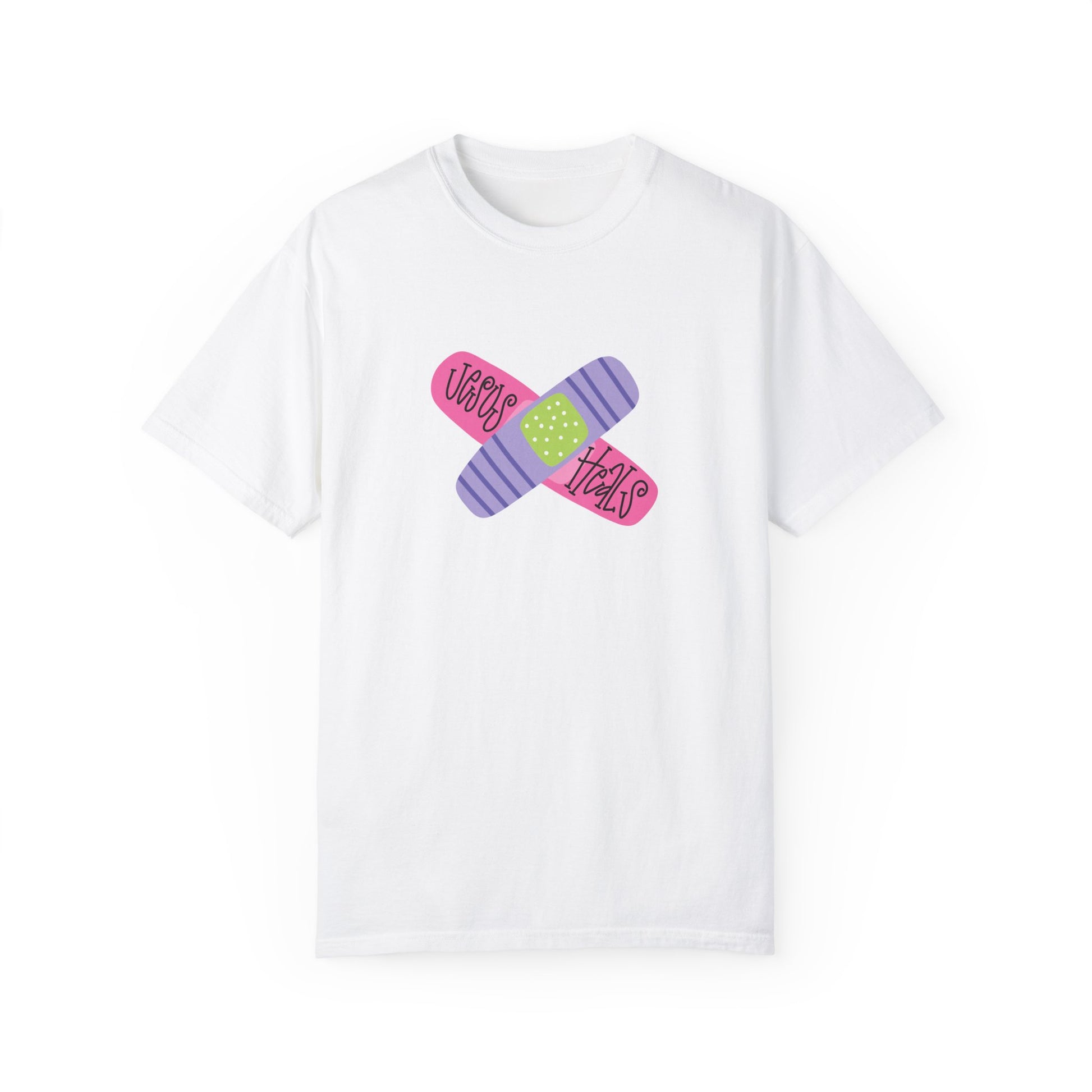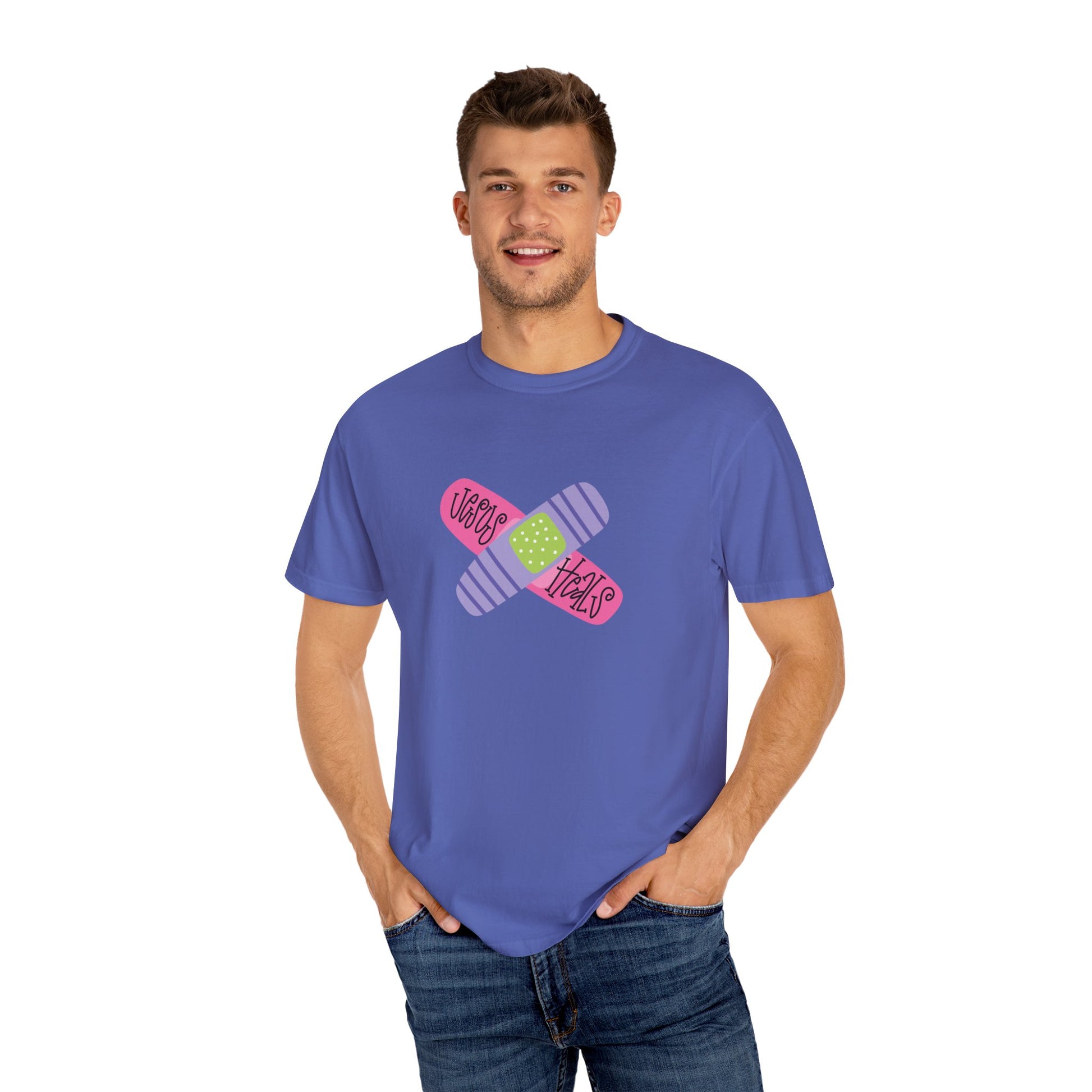 Garment-Dyed T-Shirt - "Jesus Heals" Bandage Design - Fun Graphic Tee for Health Enthusiasts