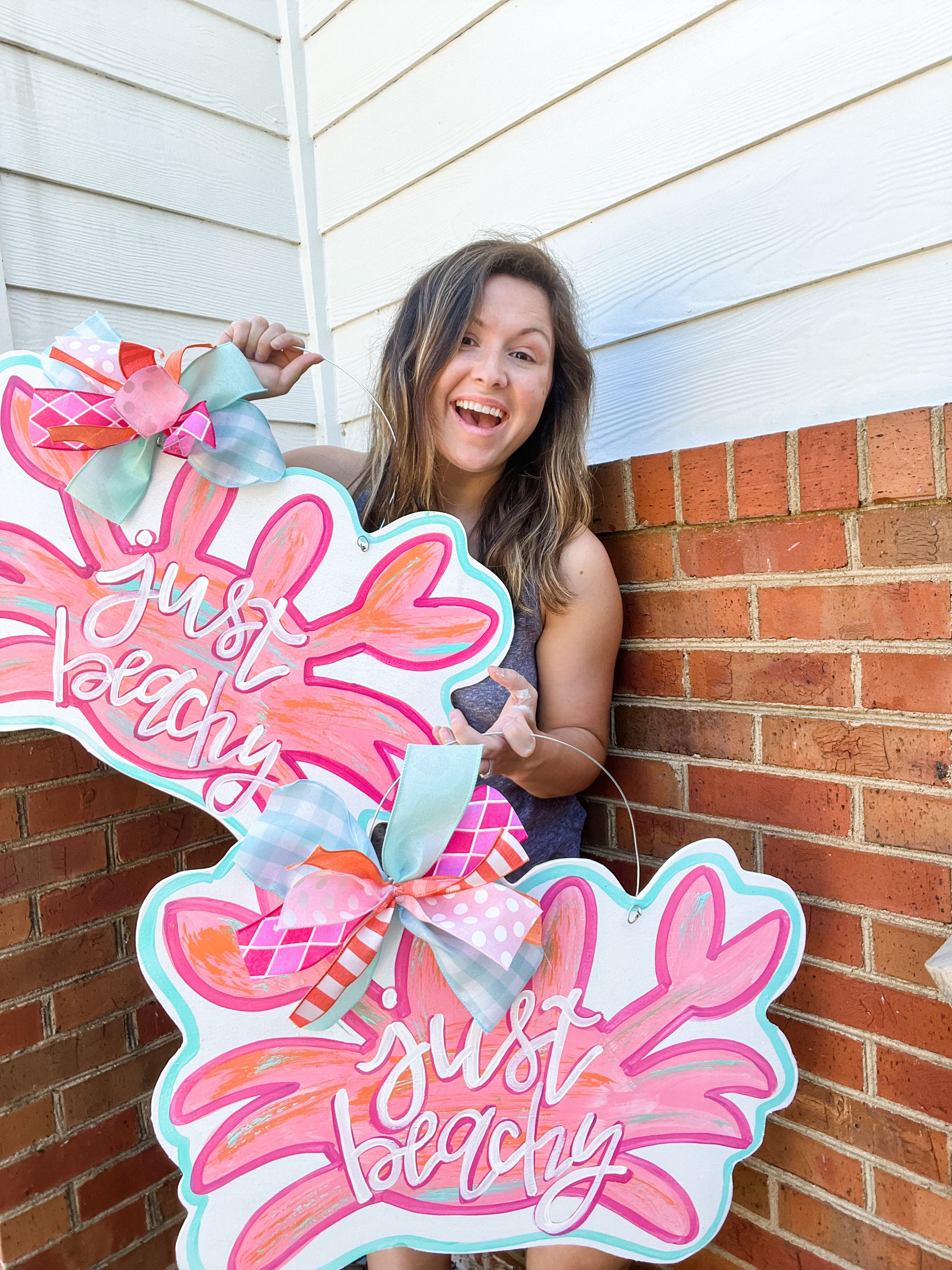 Approximately 24 x 14 inches. Hand cut hand painted. Sealed with clear coat. Bow and beads included.