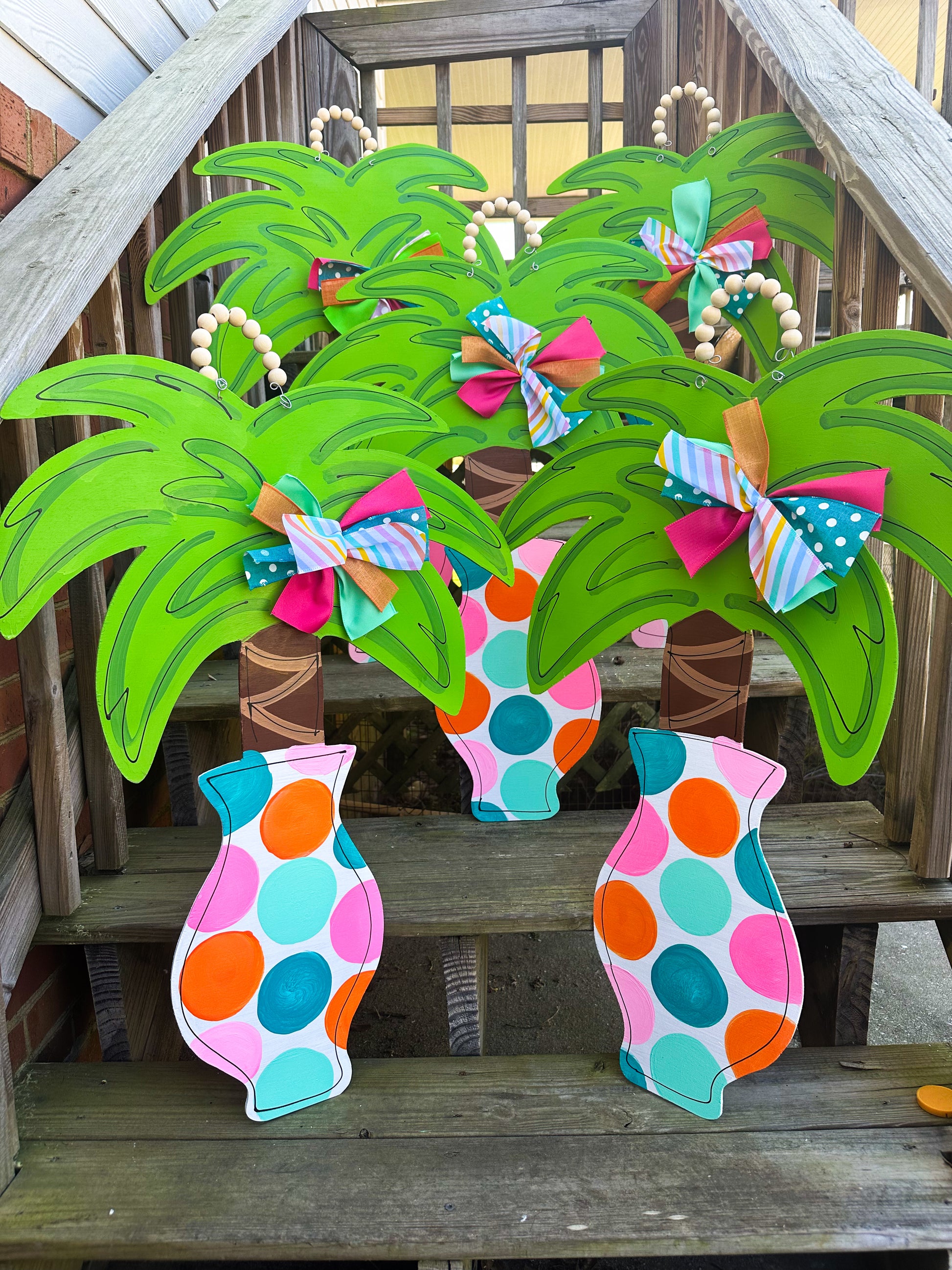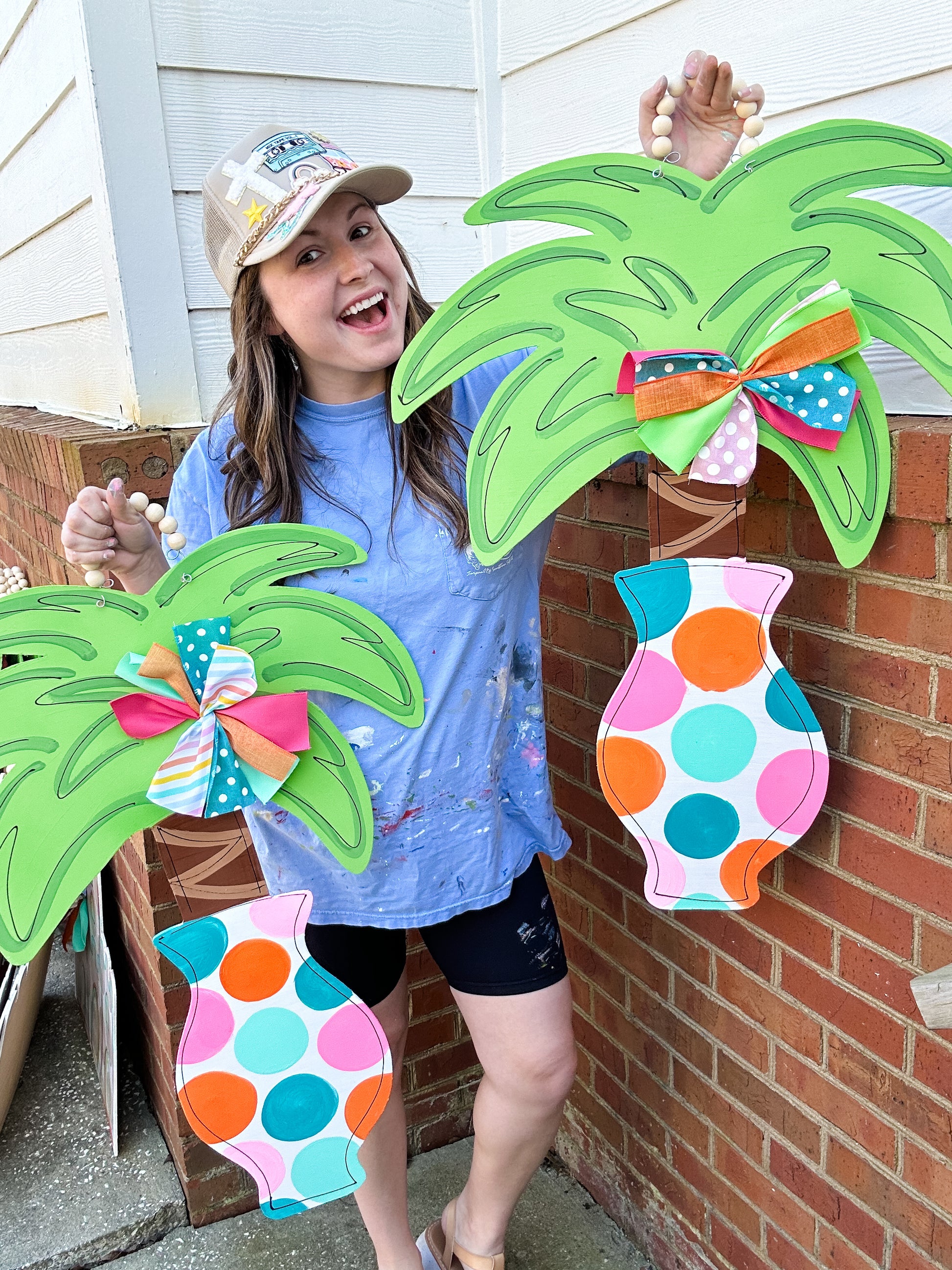 Approximately 32 inches tall. Hand Cut, hand painted. Bow and beads included.