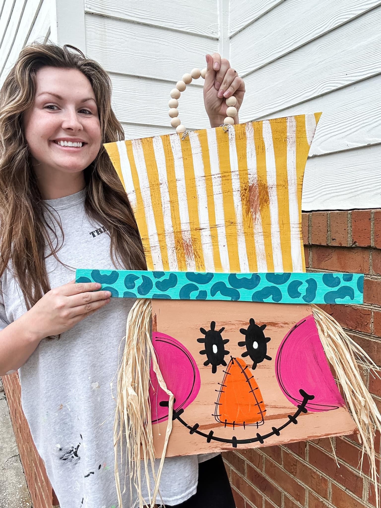 28 inches tall. Hand painted. Raffia secured to back of hanger