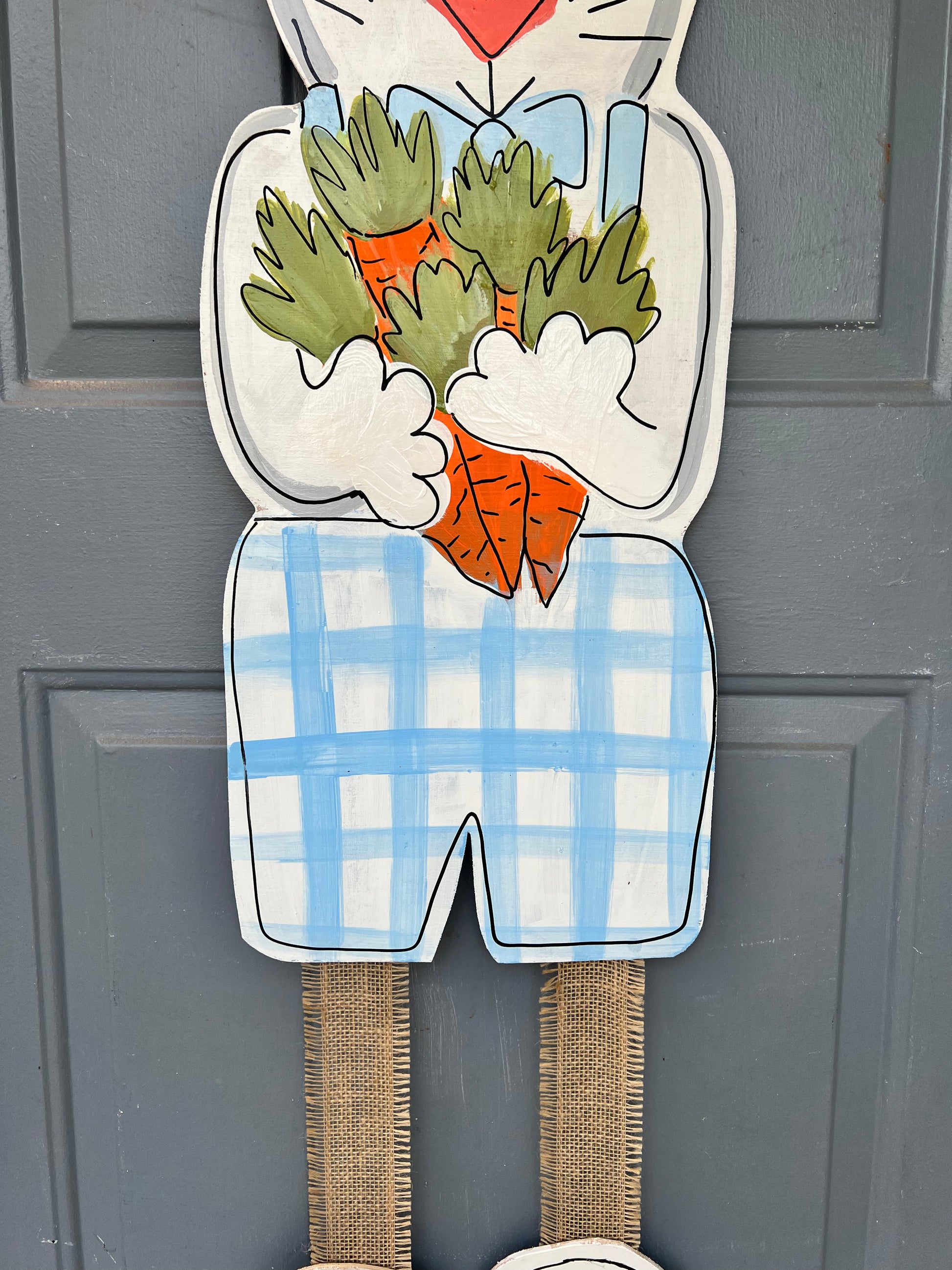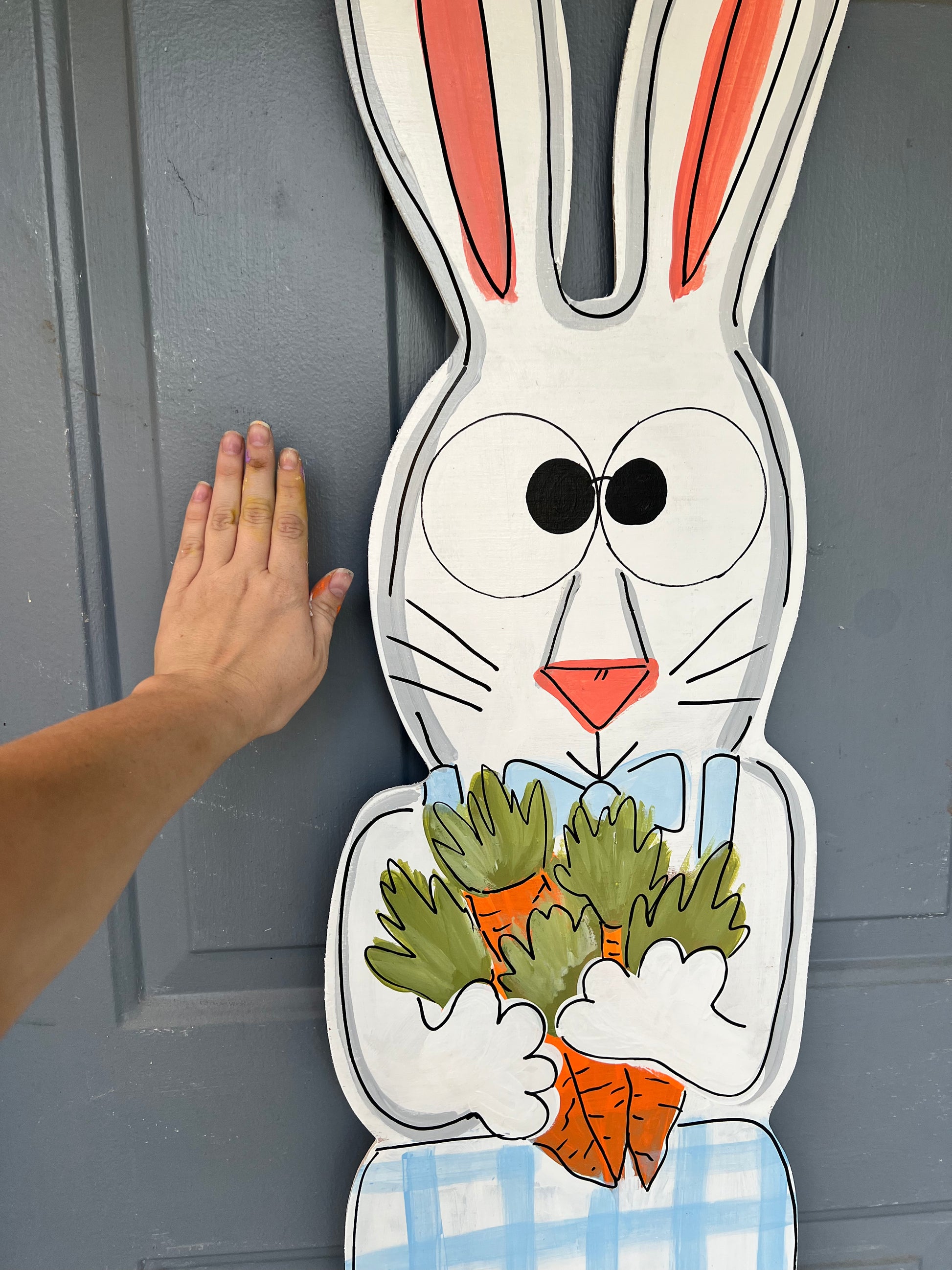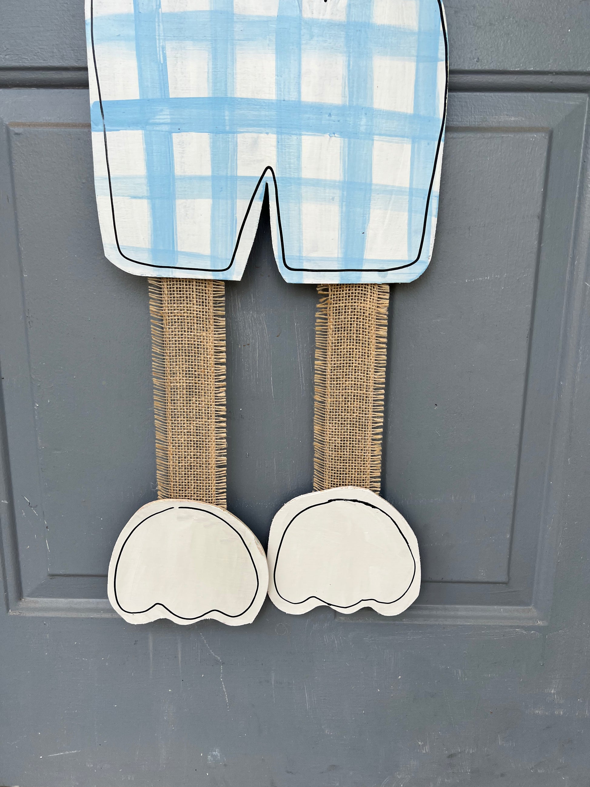 Hanging approximately 45 inches. 13 inches wide. Hand painted and sealed with two coats of clear coat. Legs attached by ribbon via hot glue.