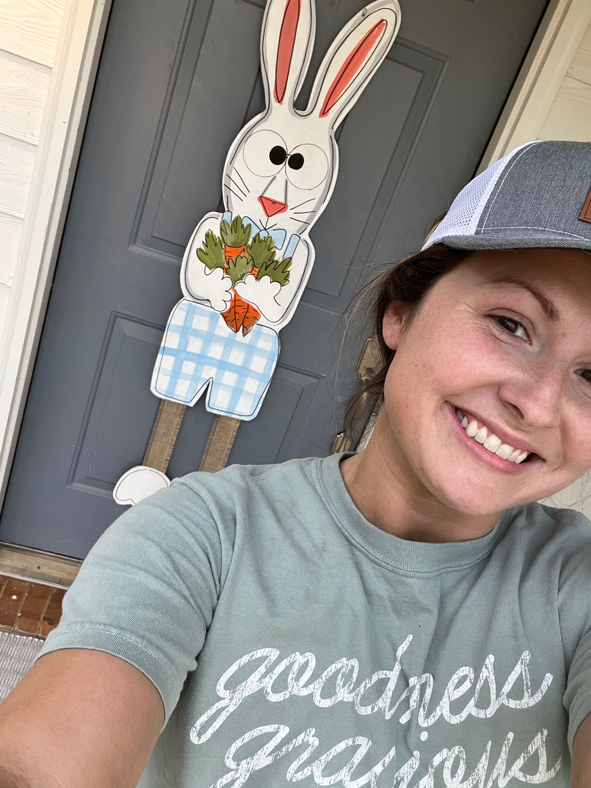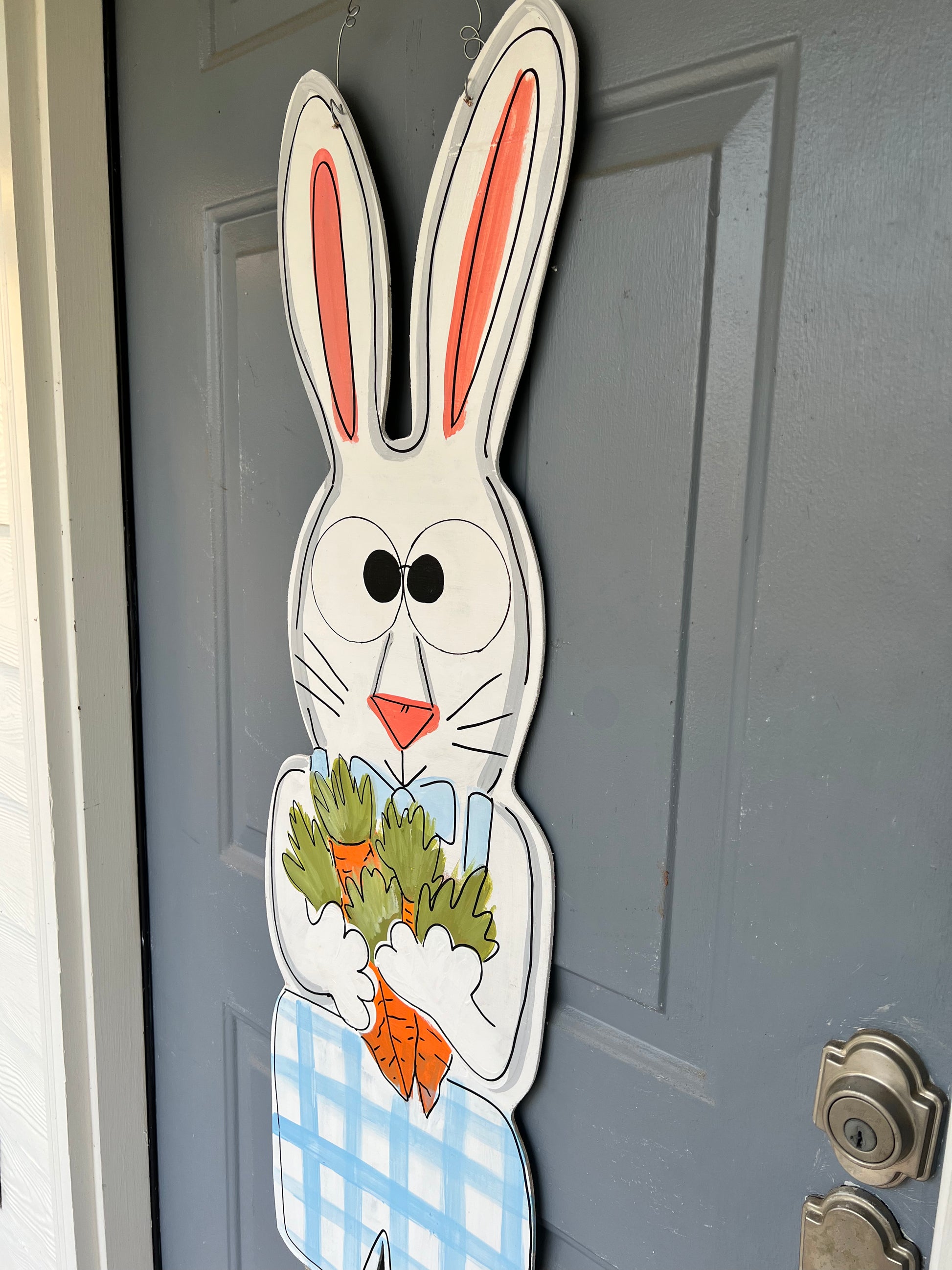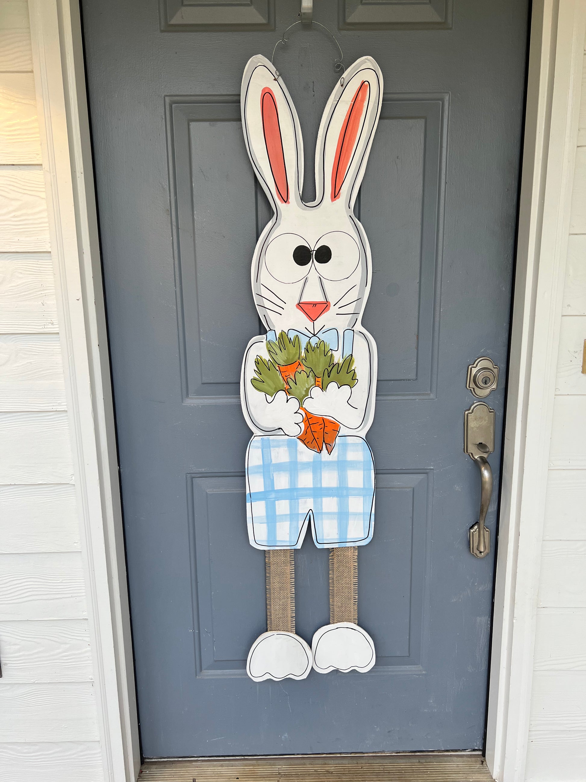 Hanging approximately 45 inches. 13 inches wide. Hand painted and sealed with two coats of clear coat. Legs attached by ribbon via hot glue.