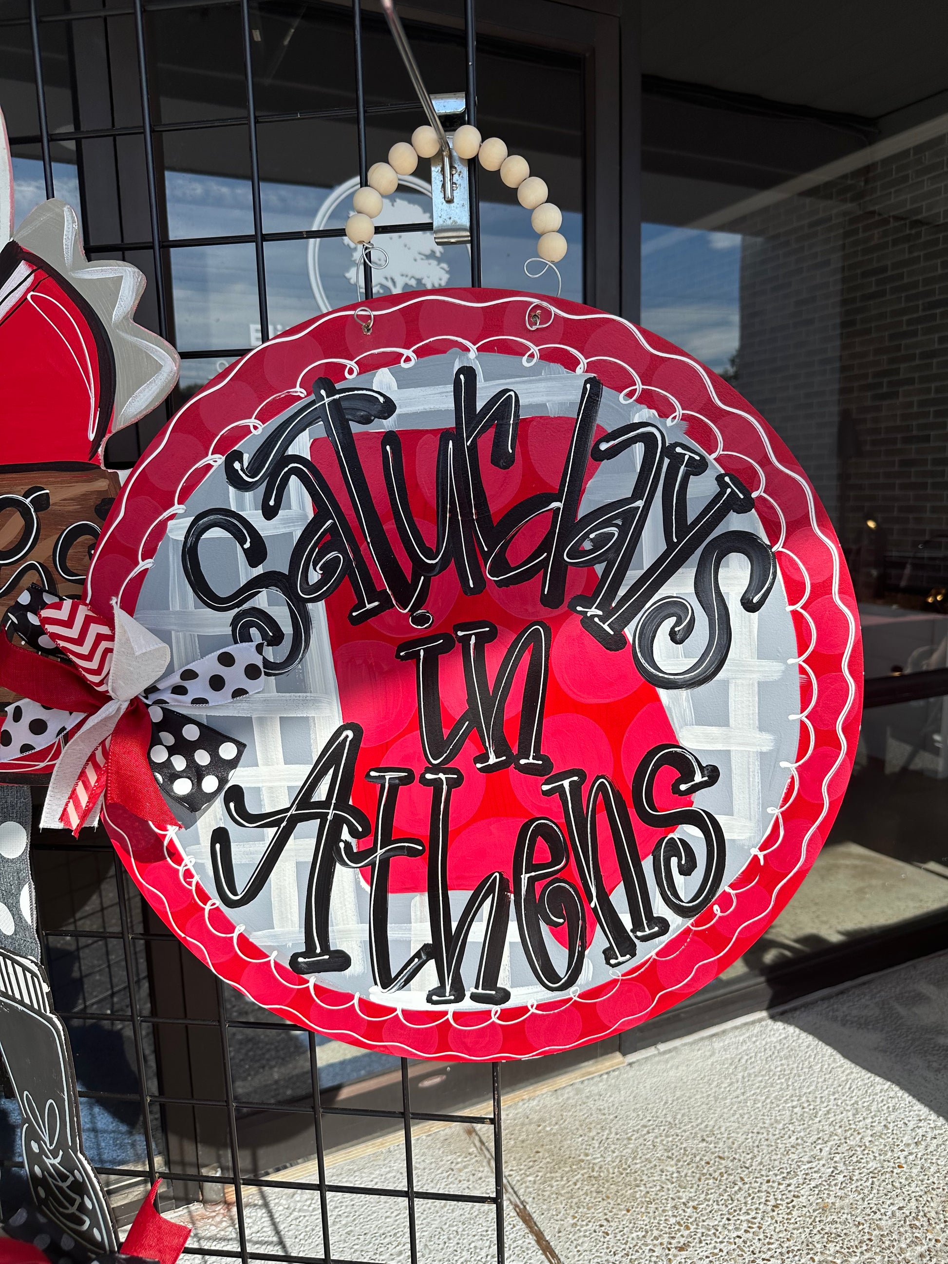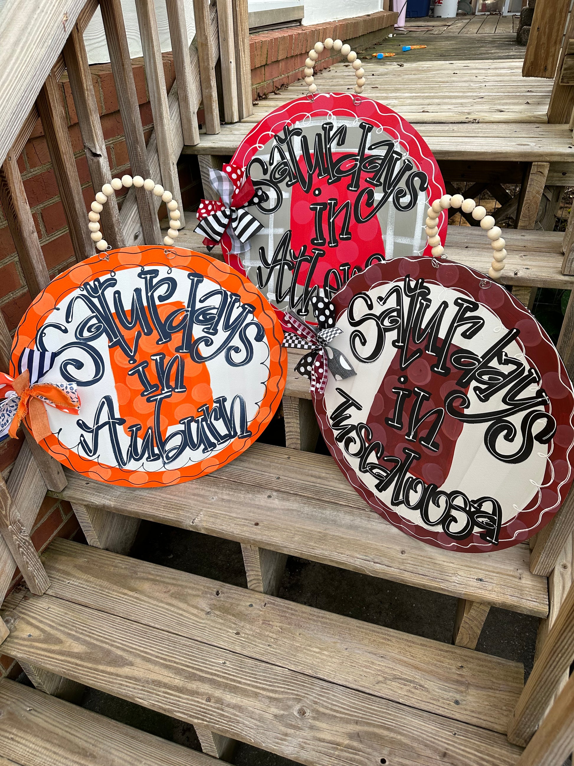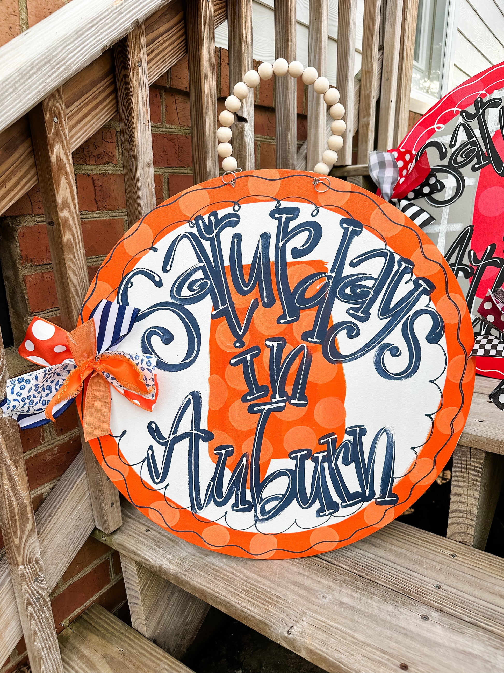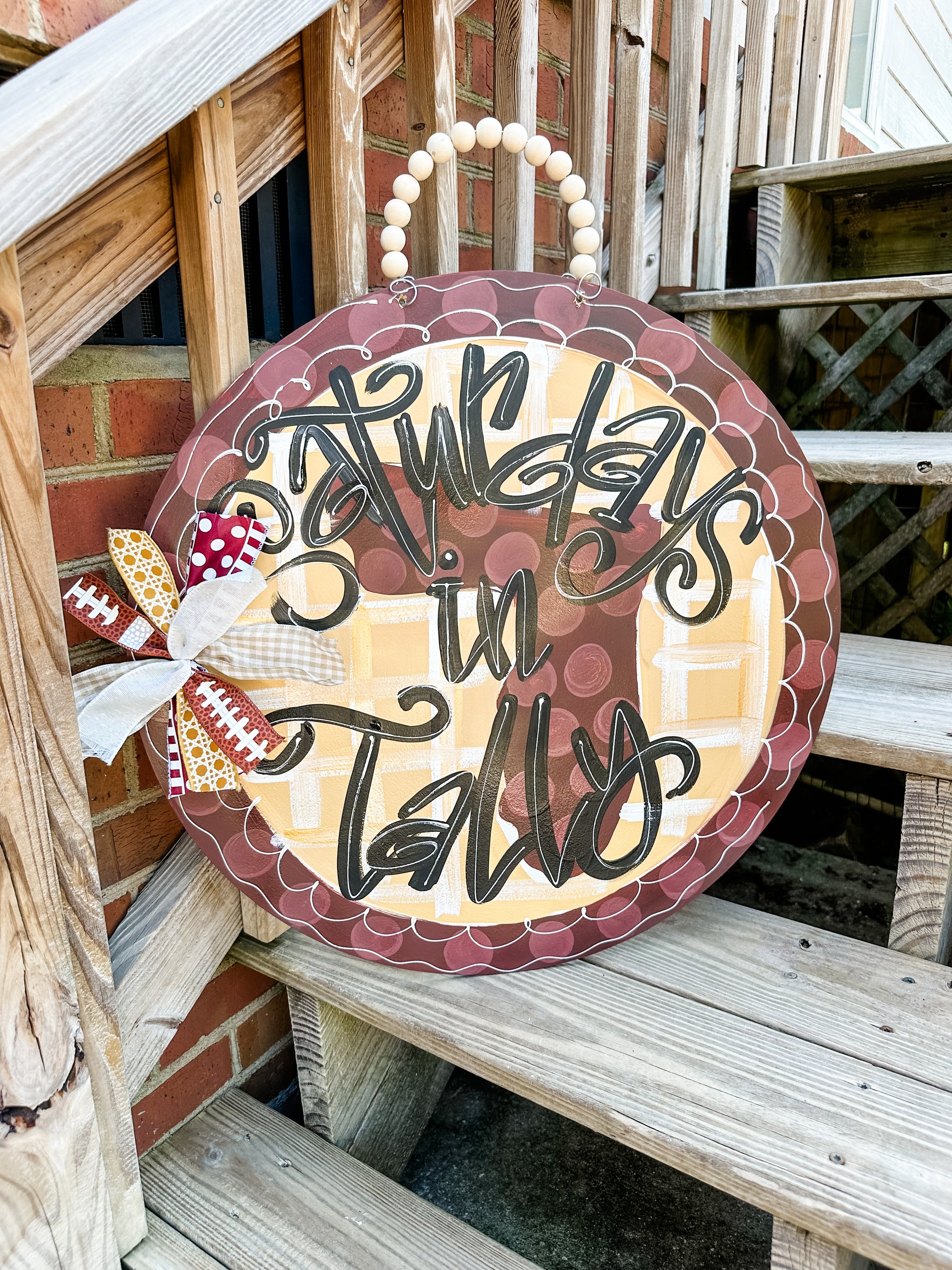 22 in round 1.4 in thick. Hand painted. Bow & beads included. Beads will not be attached if shipped, assembly will be required. Sealed with clear coat to prevent against the elements. Recommended to be hung under covered porch.