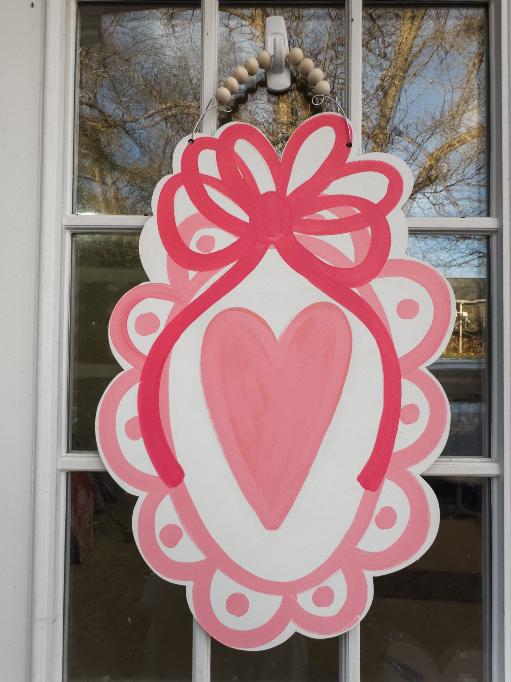 Laser cut, hand painted. Bow included. Beaded hanger included. Clear coat sealed.