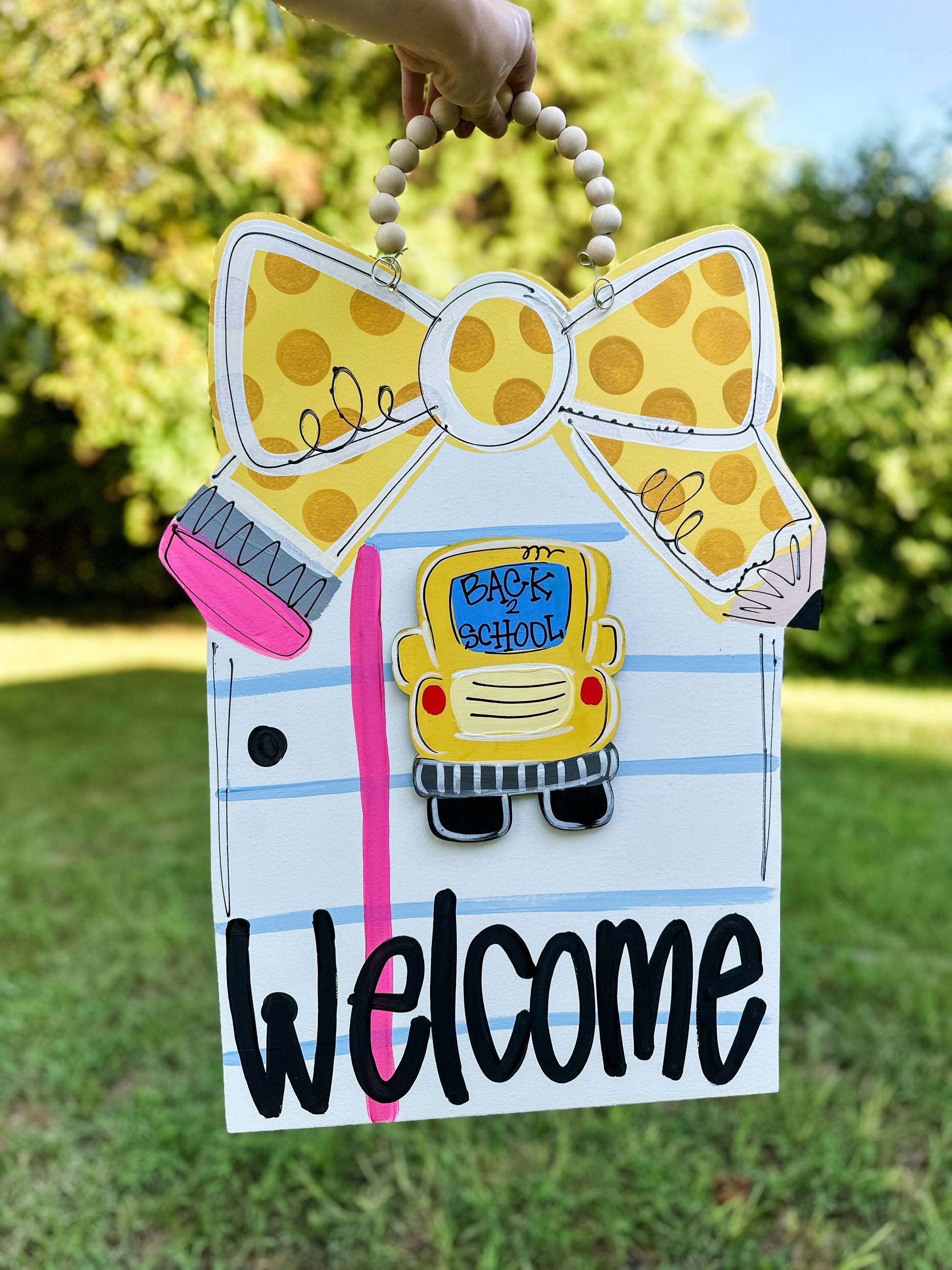 24 in tall. Hand painted. Wording on bottom can be changed by request. Please use “special instructions” box in your shopping cart after adding this item. Hard Velcro attached to hanger. Add you choice of 3 munchkins at discounted price!