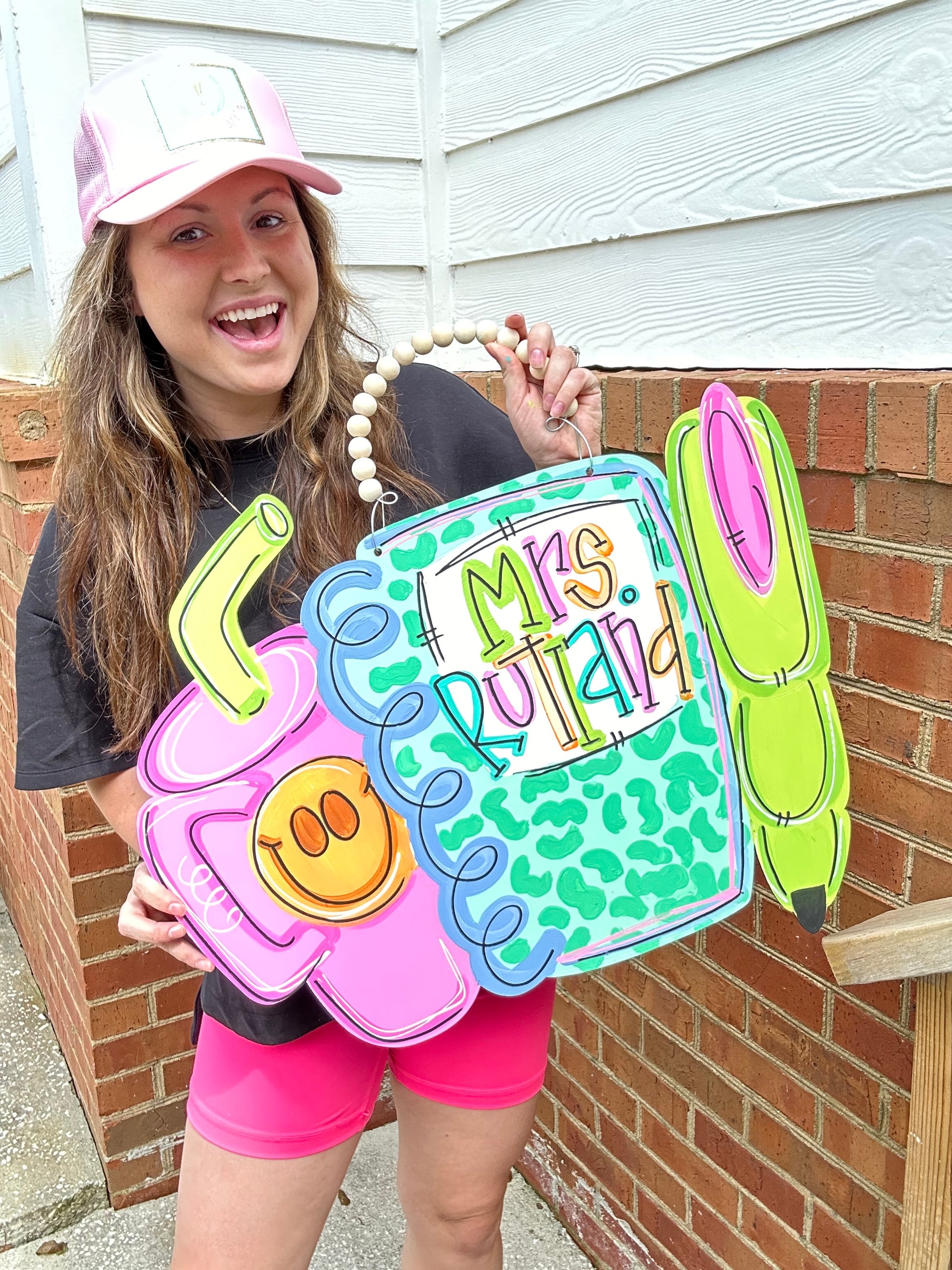 24 inches wide. 1/4 inch wood. Hand painted. Beaded wire for hanging. Please make note of teacher name in “special instructions box” located in your shopping cart.