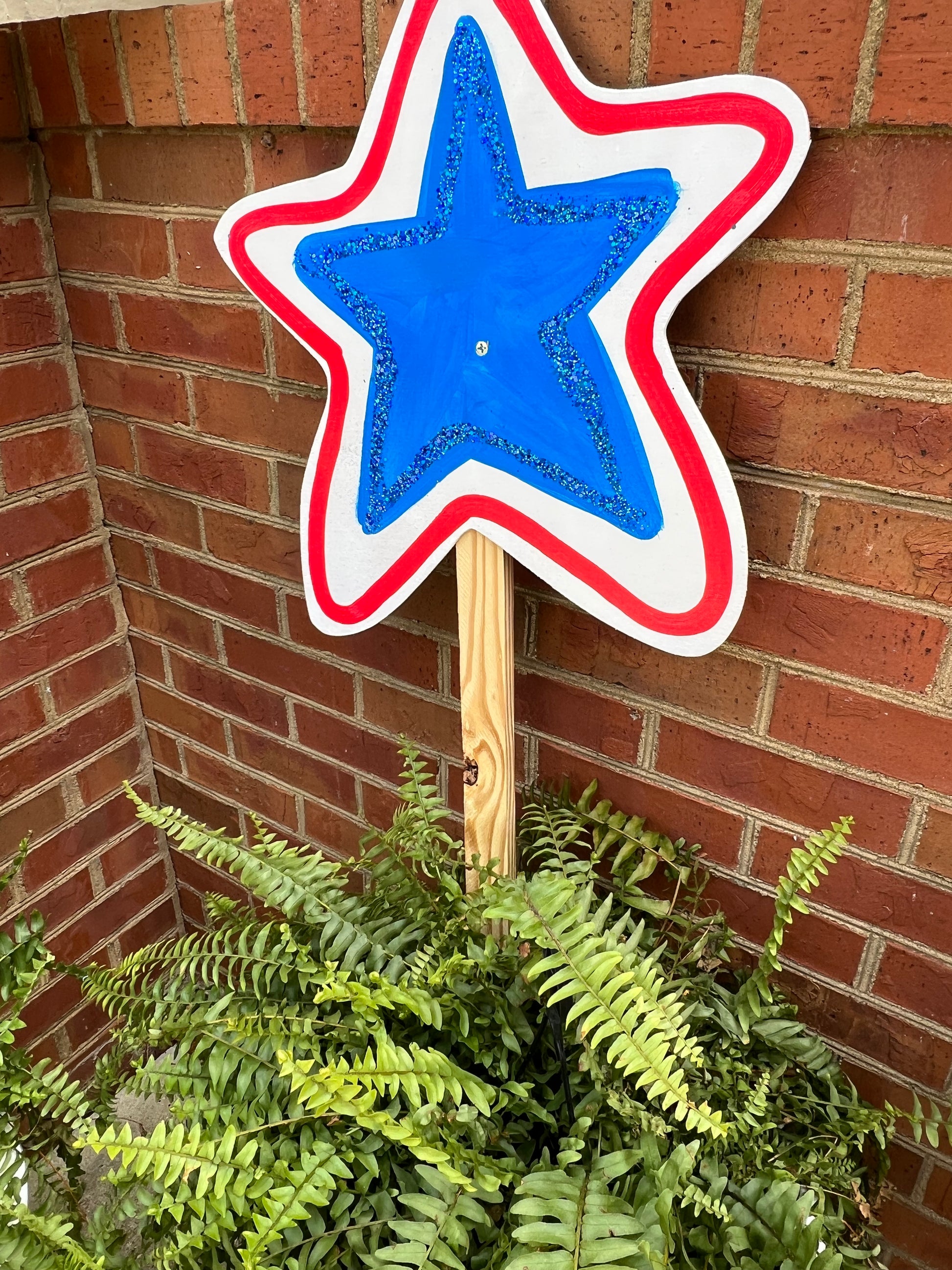 hand cut, hand painted. Glitter applied. Anchored with one screw to 36 in stake. Better under covered porch, but you can put them in the ground. Please note these are WOOD, so there is a risk of damage if not under covered area. I seal in front and back to hopefully prevent this !