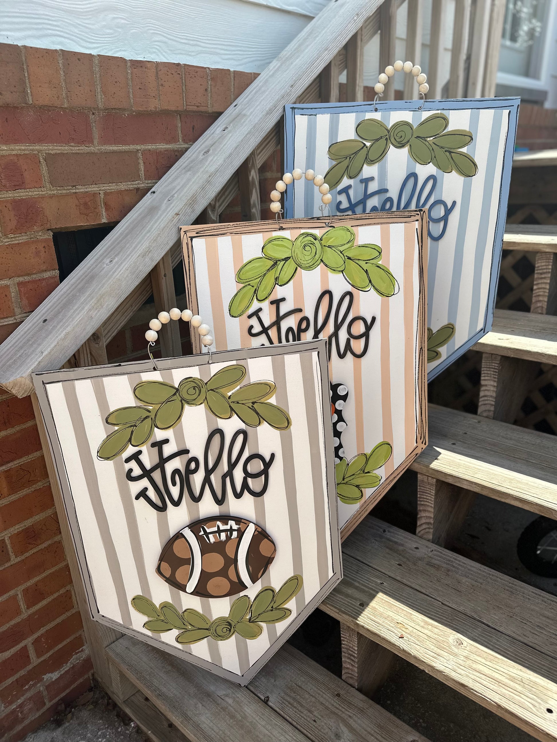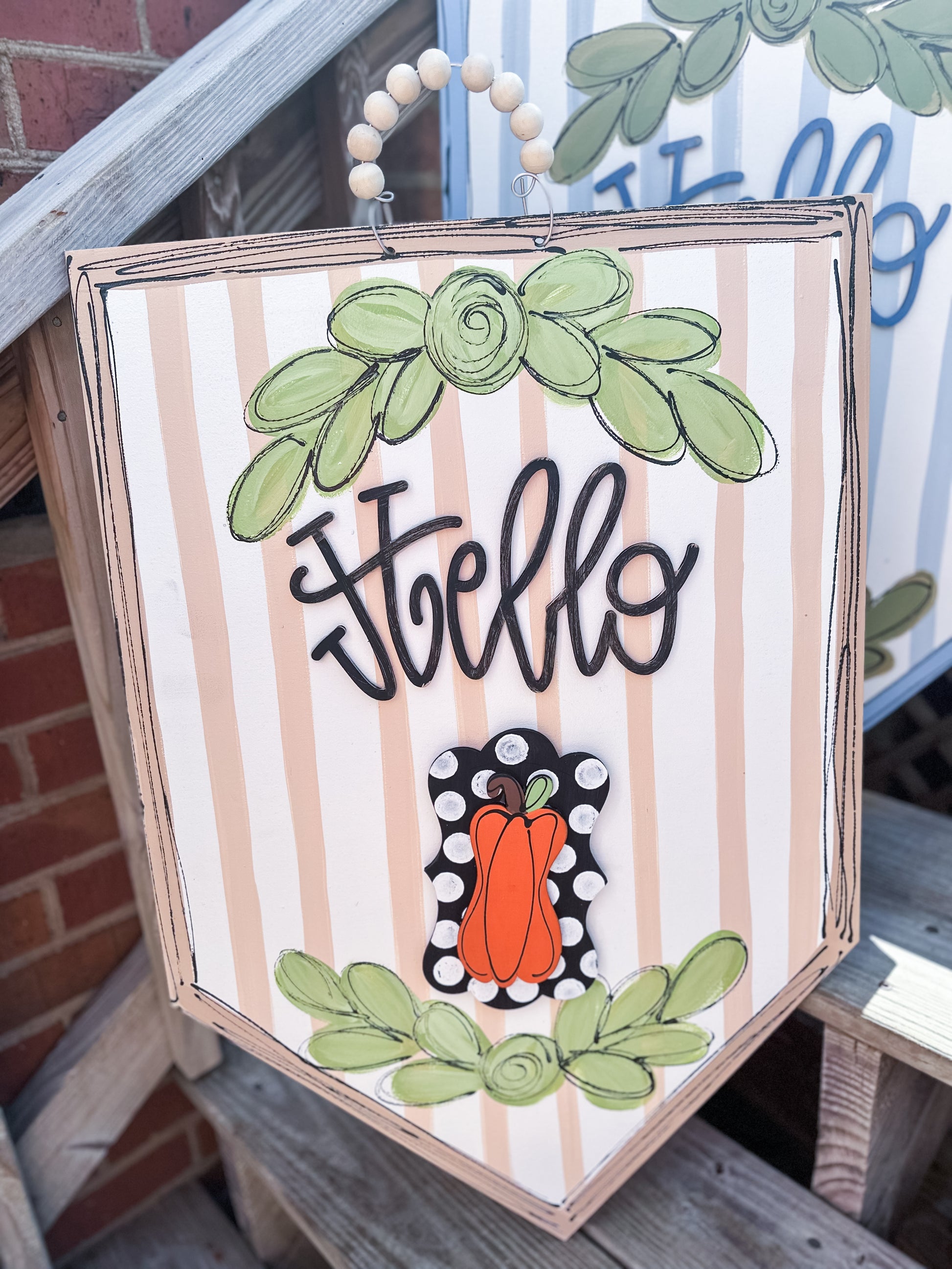 26 inches long. Fits our 8 inch munchkins. Hand painted, hello is attached using super glue. Hard side Velcro stapled to front.