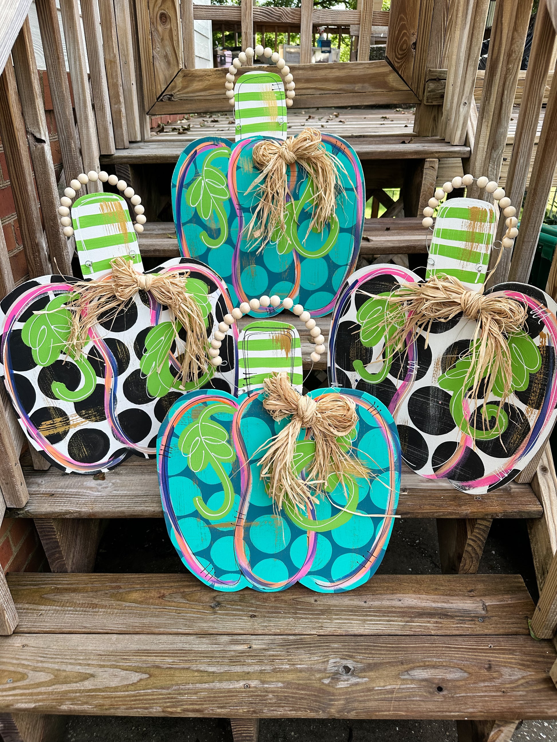 24 inch pumpkin. Hand cut hand painted. Sealed x2 with clear coat. Recommended under covered porch. Beads and rafia bow included.