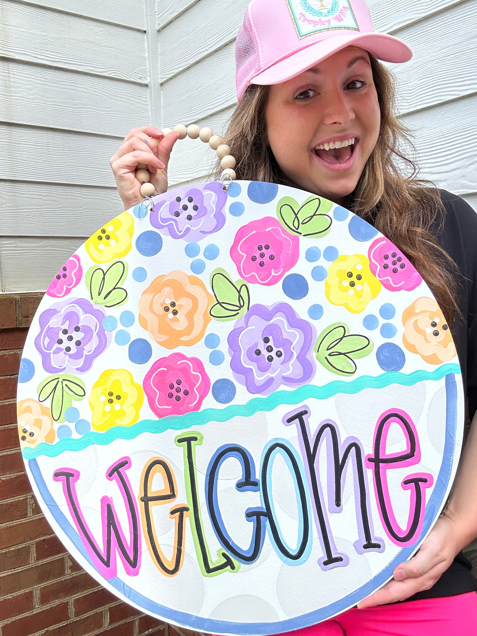 22 inch round. Hand painted. Beaded hanger included. Please indicate the name or word you would like written in bottom part of hanger in the “special instructions box” located in your shopping cart !