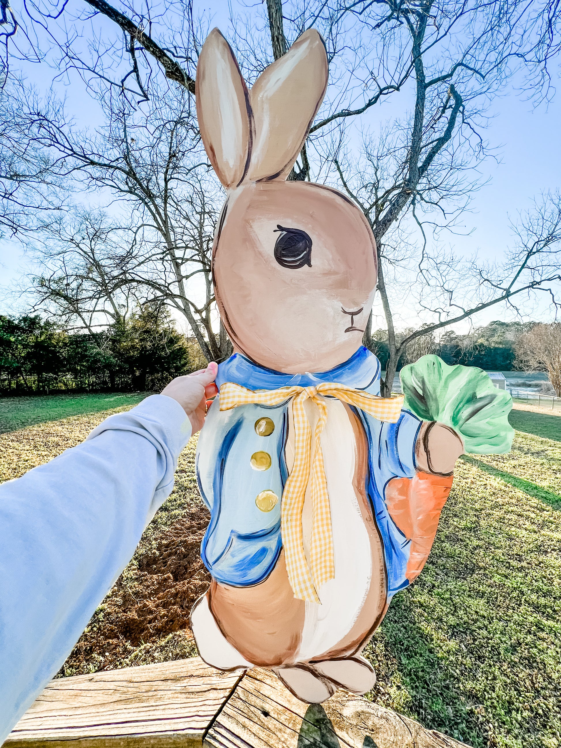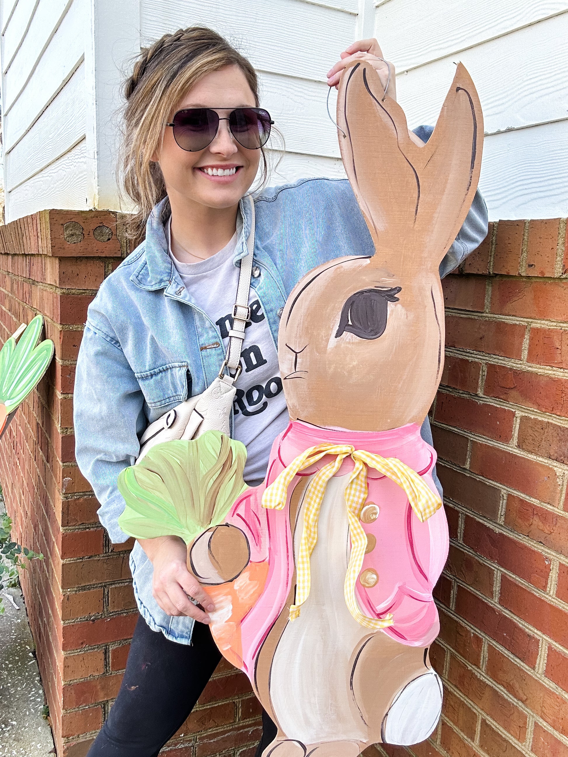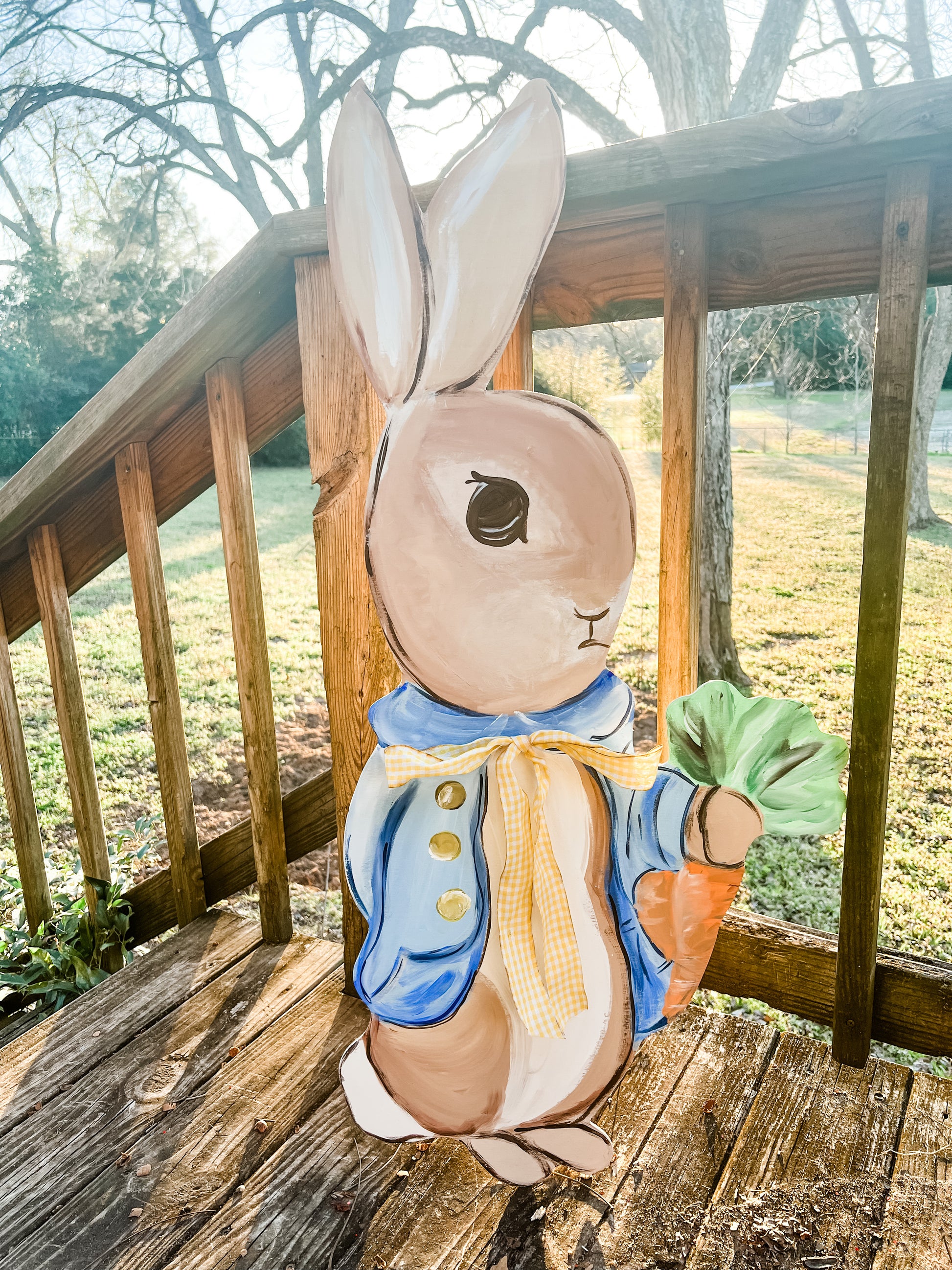 Standings approximately 38 inches tall. Hand cut and hand painted. Hanger and bow included. Jacket color can be pink or blue, please note at checkout.